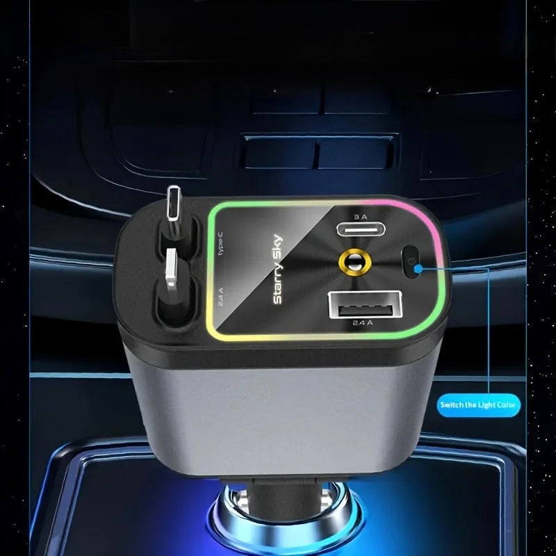 Potente, compatto e ultra-versatile: questo caricabatteria da auto è il compagno perfetto per chi vive in movimento. Grazie al design retrattile, alla ricarica rapida e all’effetto luminoso stellato, trasforma ogni viaggio in un’esperienza unica.